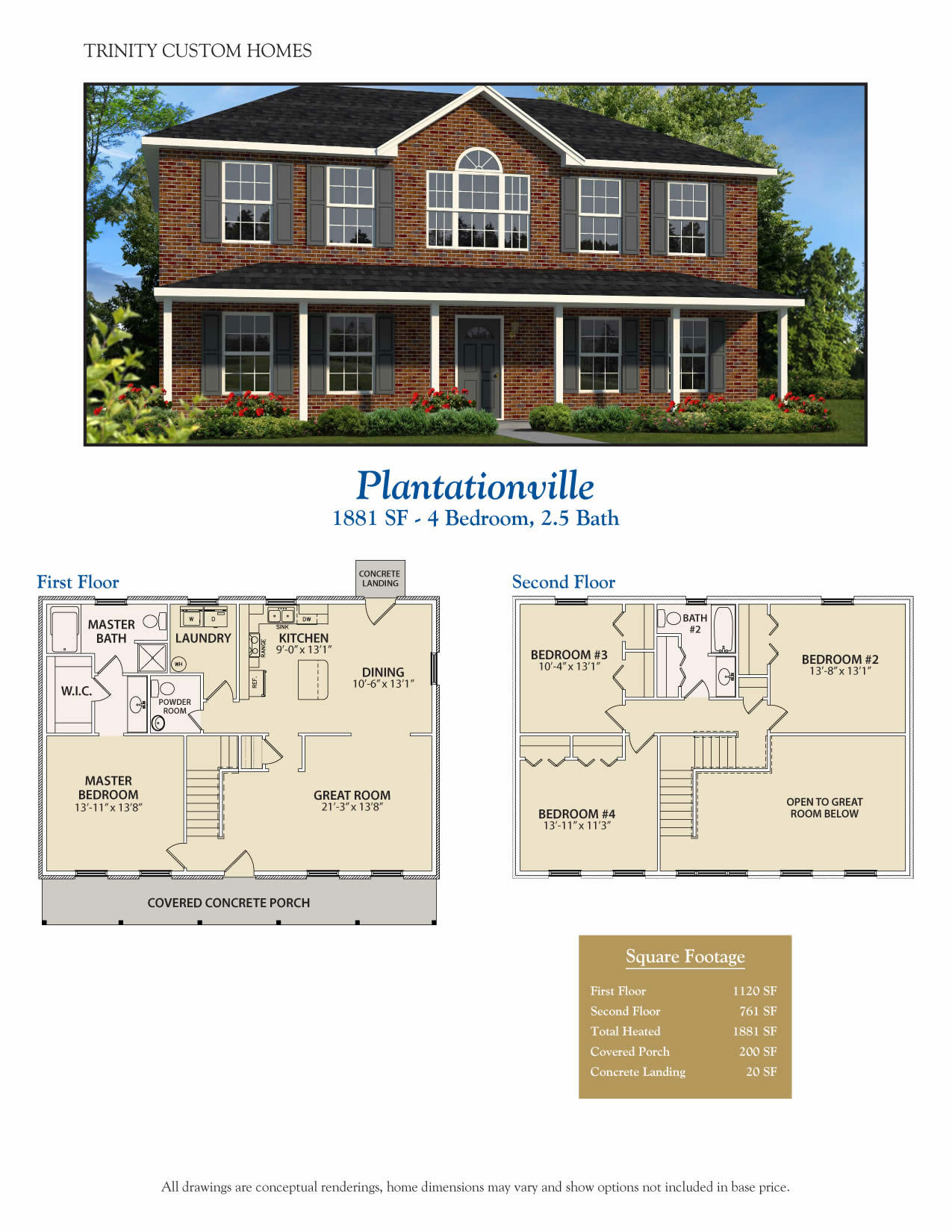 Welcome to the enchanting “Plantationville” – an exquisite two-story home plan meticulously crafted by Trinity Custom Homes. With 1881 square feet of living space, this residence offers a harmonious blend of classic charm and modern convenience.