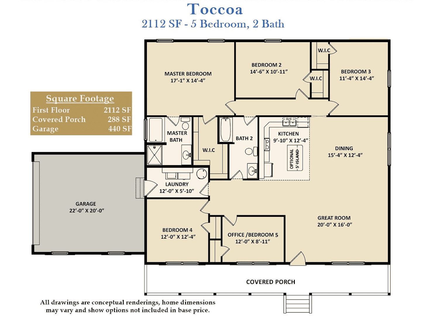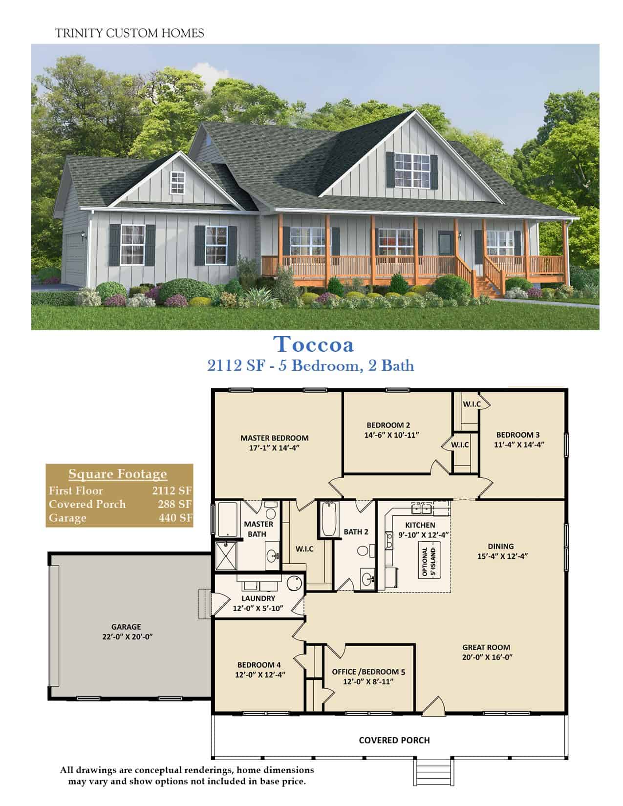 Step into a world of contemporary elegance with the Toccoa home plan. This single-story layout spans 2112 square feet and boasts 5 bedrooms and 2 bathrooms. Designed to cater to modern lifestyles, the Toccoa seamlessly blends open spaces with private retreats.