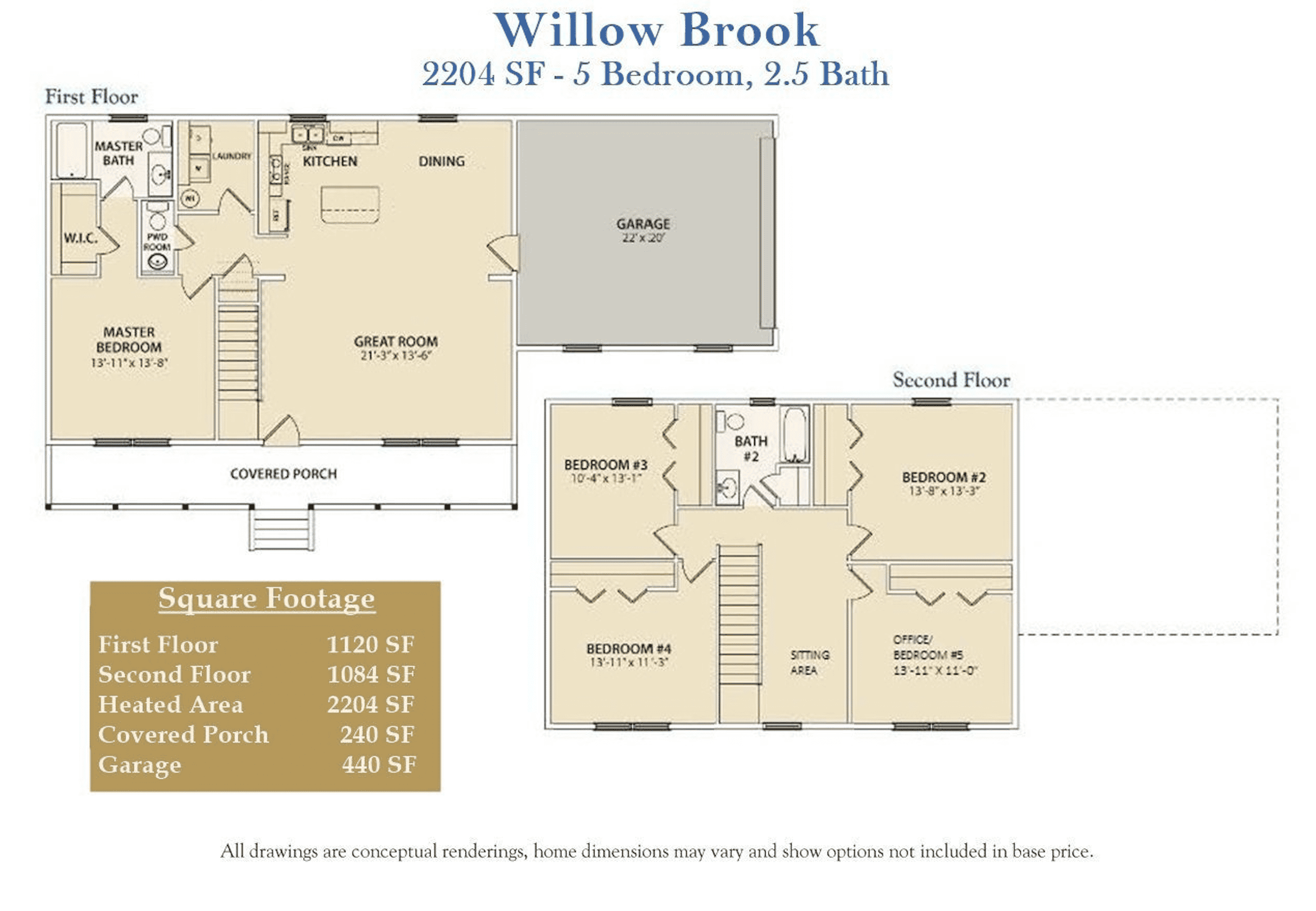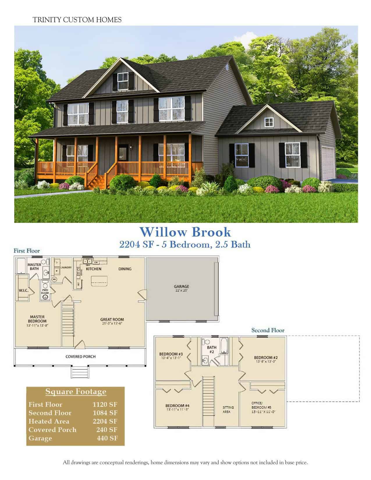 The Willow Brook custom home design by Trinity Custom Homes is a new, expanded version of our classic Cherokee Farmhouse plan, perfect for larger families. With a fully covered 6’ front porch, two-car garage, and a main-floor master bedroom, this home offers comfort and space. It features 5 bedrooms, 2 1/2 bathrooms, and ample room for cherished memories.